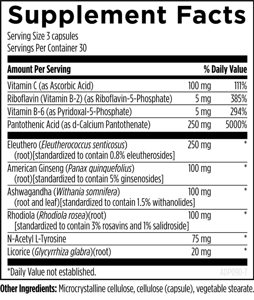 Adrenotone™ is a combination of standardized adaptogenic herbs and nutrients that are known to contribute to the support of adrenal health and function.* This product is designed to help support healthy cortisol metabolism, hypothalamic and pituitary function (HPA axis), and catecholamine production (dopamine, norepinephrine, and epinephrine).*