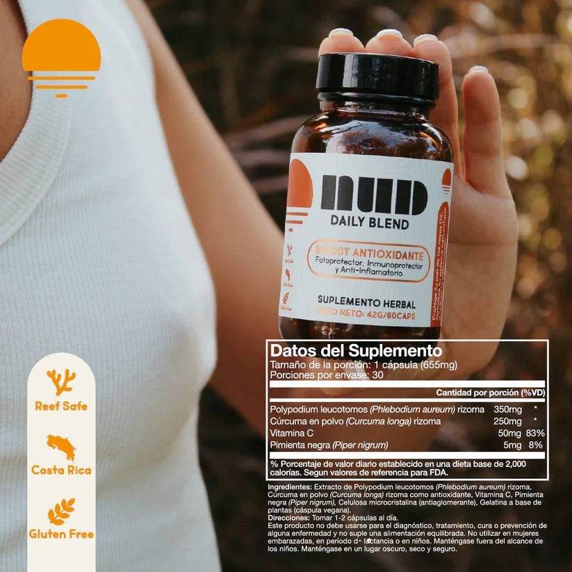 Daily Blend is a formula with a high percentage of anti-inflammatory, antioxidant, and photoprotective properties that works from your digestive system to your muscles and skin. Your immune system will be stronger than ever, keeping inflammation levels low and protecting your skin.